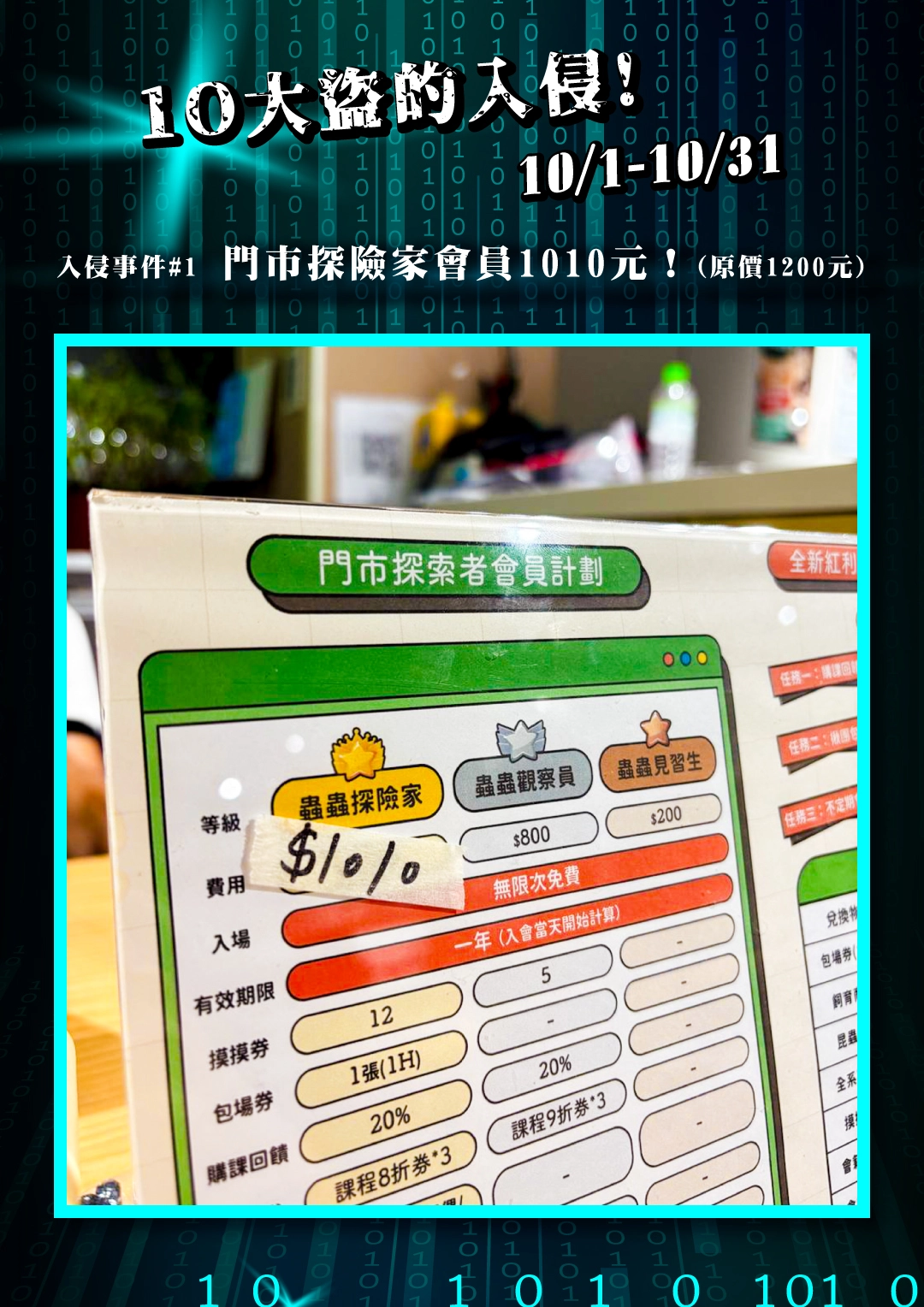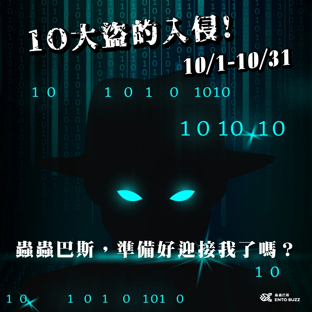 🌟 蟲蟲巴斯十月企劃 「10大盜入侵!!!🕶️🕵️♂️」 📅 接下來的整個十月,我們將在每週五偵破 10大盜的案行 🔎 找出他到底又對我們動了什麼手腳 🪄🎯 而各位大小朋友的任務 📝 便是把握 10大盜提供的機會 ✨ 在這個十月來蟲蟲巴斯獲得最佳優惠以及與動物們創造精彩回憶📸! 10/3 10/10 (偵查中) 10/17 (偵查中) 10/24 (偵查中)