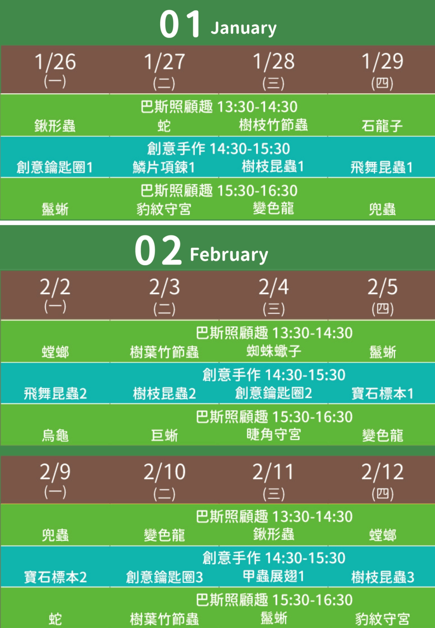 寒假下午我們安排了三堂課,包括昆蟲飼養或是動物餵食照顧,還有一堂有趣的手作課!輕鬆活潑的課程適合學齡前的小朋友,透過與動物互動激發小朋友的好奇心與觀察力! - 可單堂可多堂,寒假行程彈性好安排
